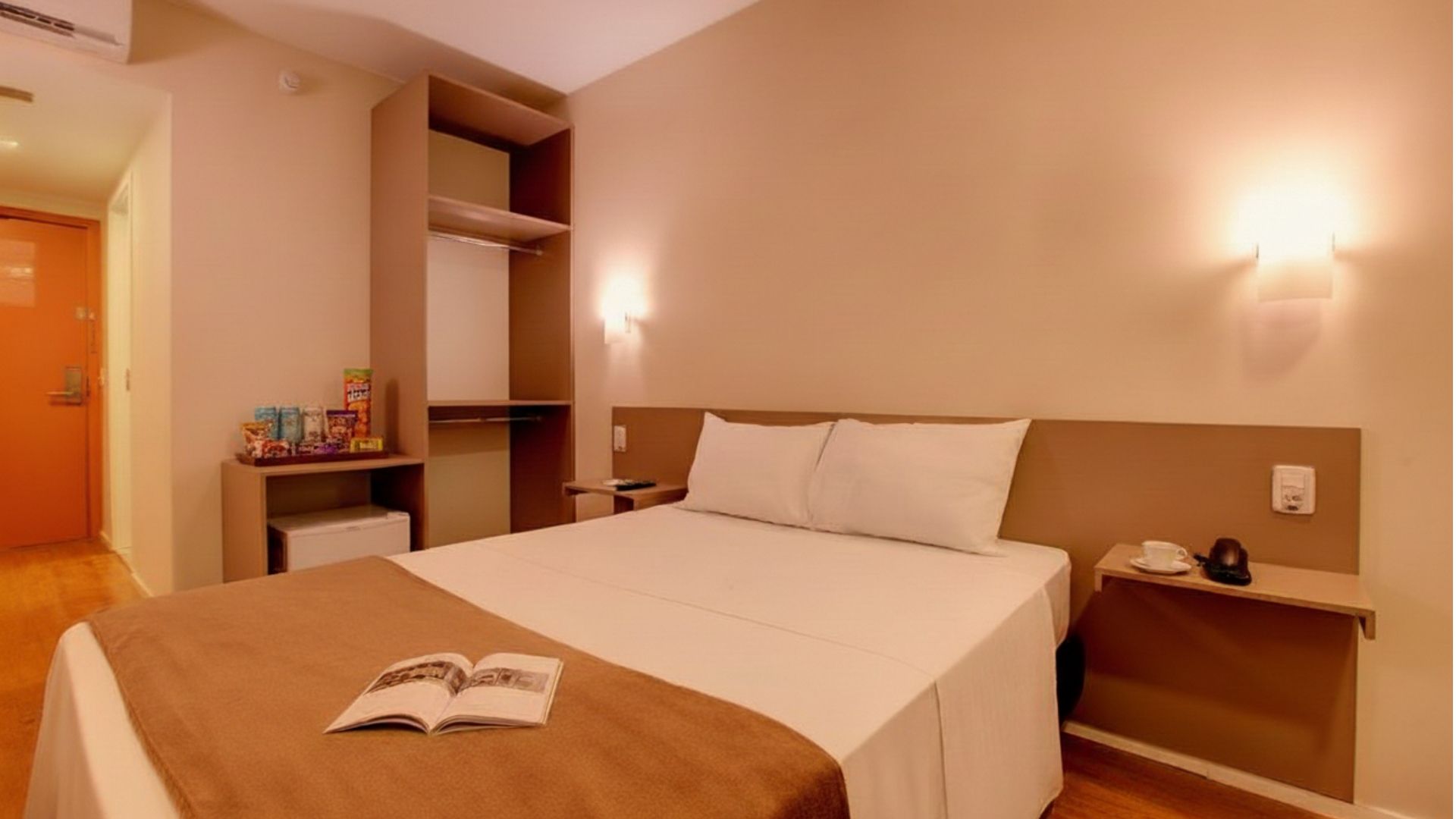 - Ar-condicionado, cama confortável, mesa de trabalho e cortinas blackout