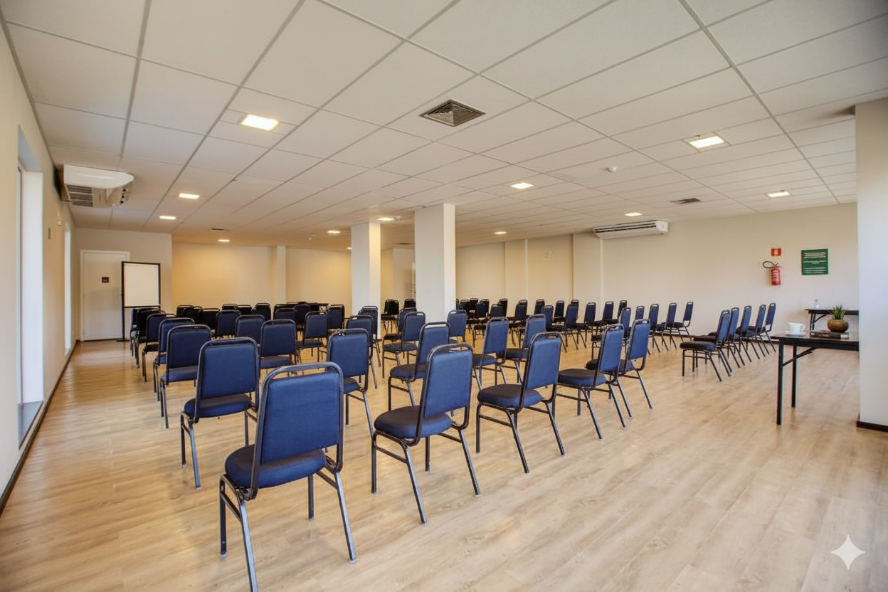 Sala de eventos de 110 m², com ar-condicionado, Wi-Fi, capacidade para até 80 pessoas. Ideal para reuniões corporativas presenciais, híbridas e videoconferências.
