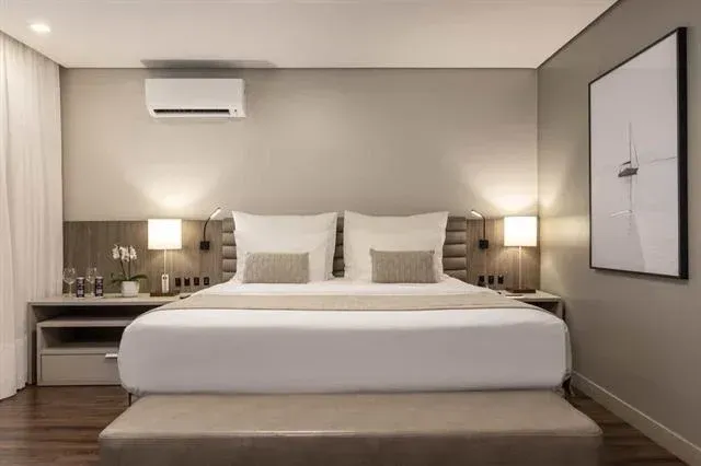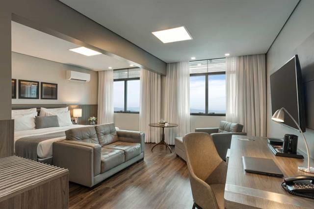 Suíte de 30m² com uma cama casal queen size e com vista lateral ou cidade para a cidade de Florianópolis. O apartamento dispõe de banheira de imersão, ar-condicionado com controle individual, Smart TV, TV a cabo com canais internacionais, telefone, internet wi-fi, cofre digital, mesa de trabalho, frigobar, kit amenities e secador de cabelo de 1900 W, além do Kit boas-vindas com chaleira elétrica e seleção de chás como cortesia.