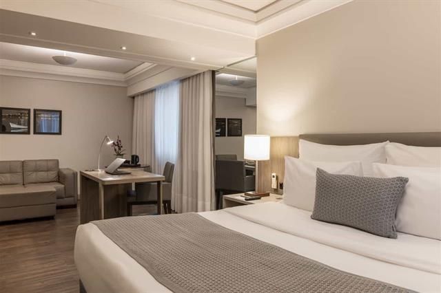 Suíte de 35m² com duas camas de solteiro em andar baixo e vista para cidade. O apartamento dispõe de banheira de imersão, ar-condicionado com controle individual, Smart TV, TV a cabo com canais internacionais, telefone, internet wi-fi, cofre digital, mesa de trabalho, frigobar, kit amenities e secador de cabelo de 1900 W, além do Kit boas-vindas com chaleira elétrica e seleção de chás como cortesia.